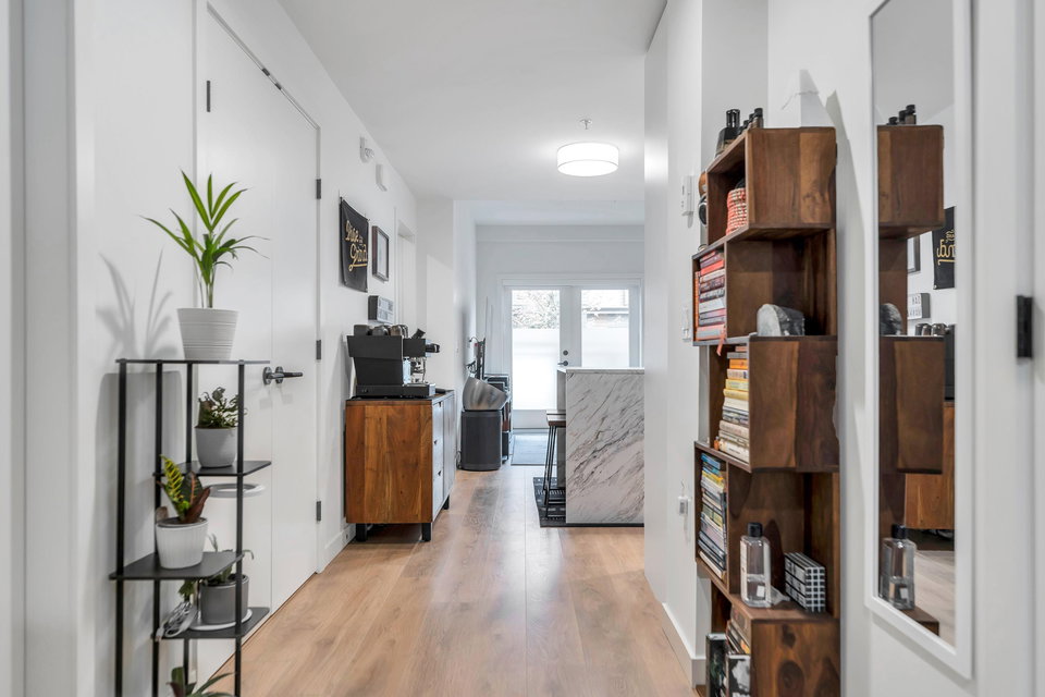 GARDEN-LEVEL END-UNIT at The Trails in Moodyville offering bright, open living and a private fenced patio surrounded by greenery. Wide-plank flooring, high ceilings and large windows create a bright and airy feel throughout. Modern kitchen with gas cooktop, stainless appliances and kitchen island for everyday living and entertaining. Thoughtful bedroom separation provides privacy, while the primary suite features generous closets and a well-finished ensuite. Newer construction with easy transit access across the North Shore and into Vancouver. Steps to the Spirit Trail and minutes to Lower Lonsdale shops, dining and waterfront — a perfect blend of comfort and walkable lifestyle.