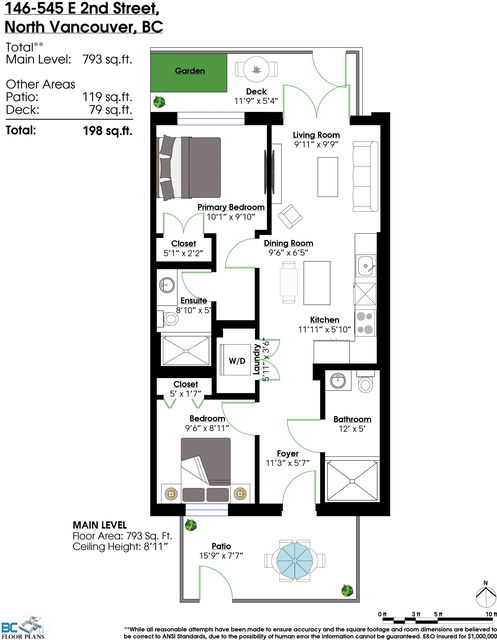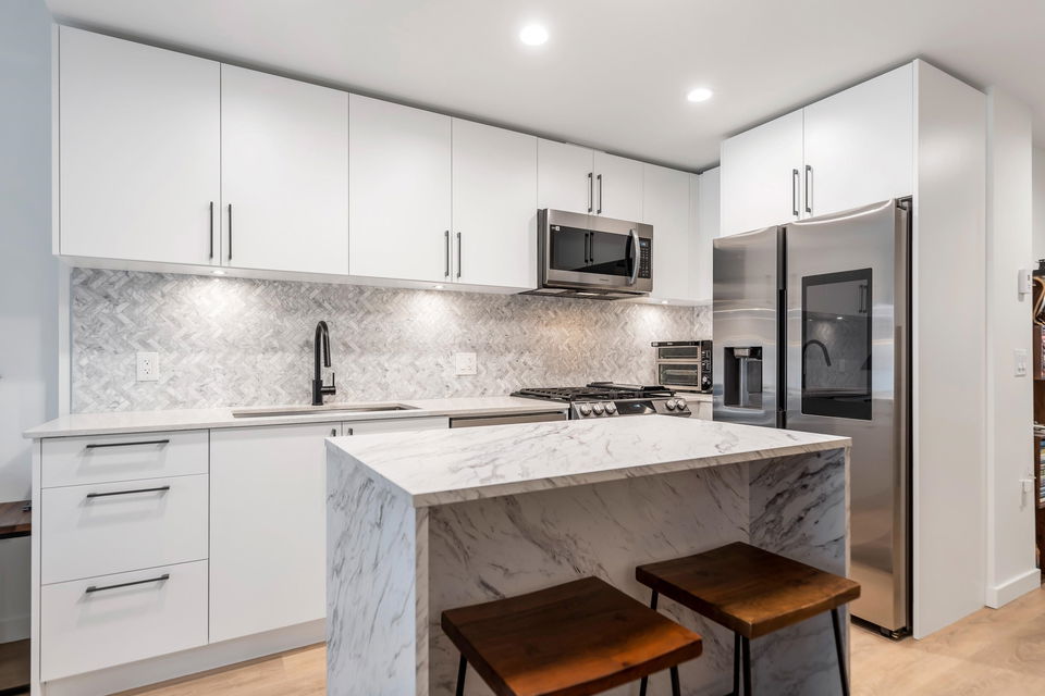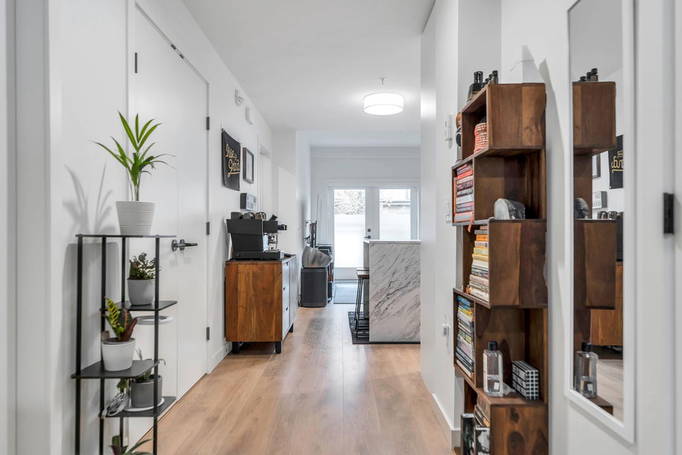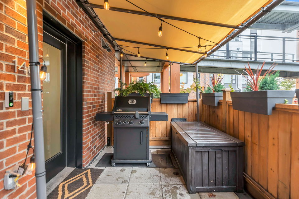 Welcome to The Trails, a thoughtfully designed community in the heart of Moodyville. Garden-level, end-unit townhome offers an indoor/outdoor flow, a private, fully-fenced patio surrounded by lush landscaping. The open-plan layout provides a spacious feeling with wide-plank flooring, high ceilings & windows, enhancing natural light throughout. A stylish kitchen features a gas cooktop, stainless steel appliances, & an island ideal for everyday living & entertaining. Bedrooms are thoughtfully separated for privacy. The primary suite offers ample closet spaces & a well-appointed ensuite. Enjoy the benefits of a newer home, easy transit connections linking all of the North Shore and Vancouver. Steps to the Spirit Trail, Lower Lonsdale shops & restaurants. A location & home that has it all!