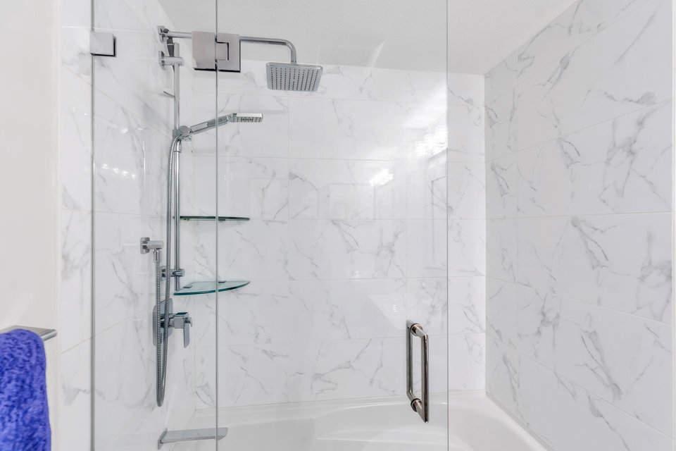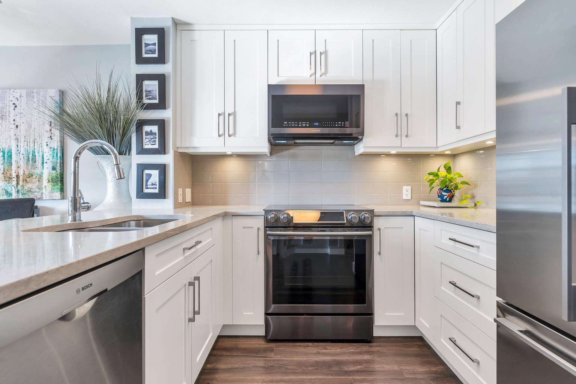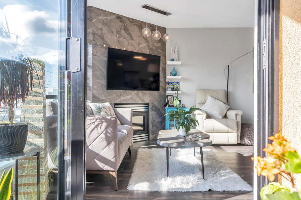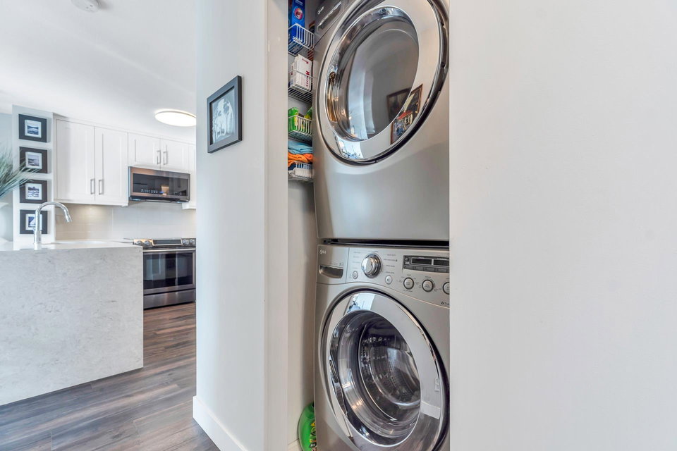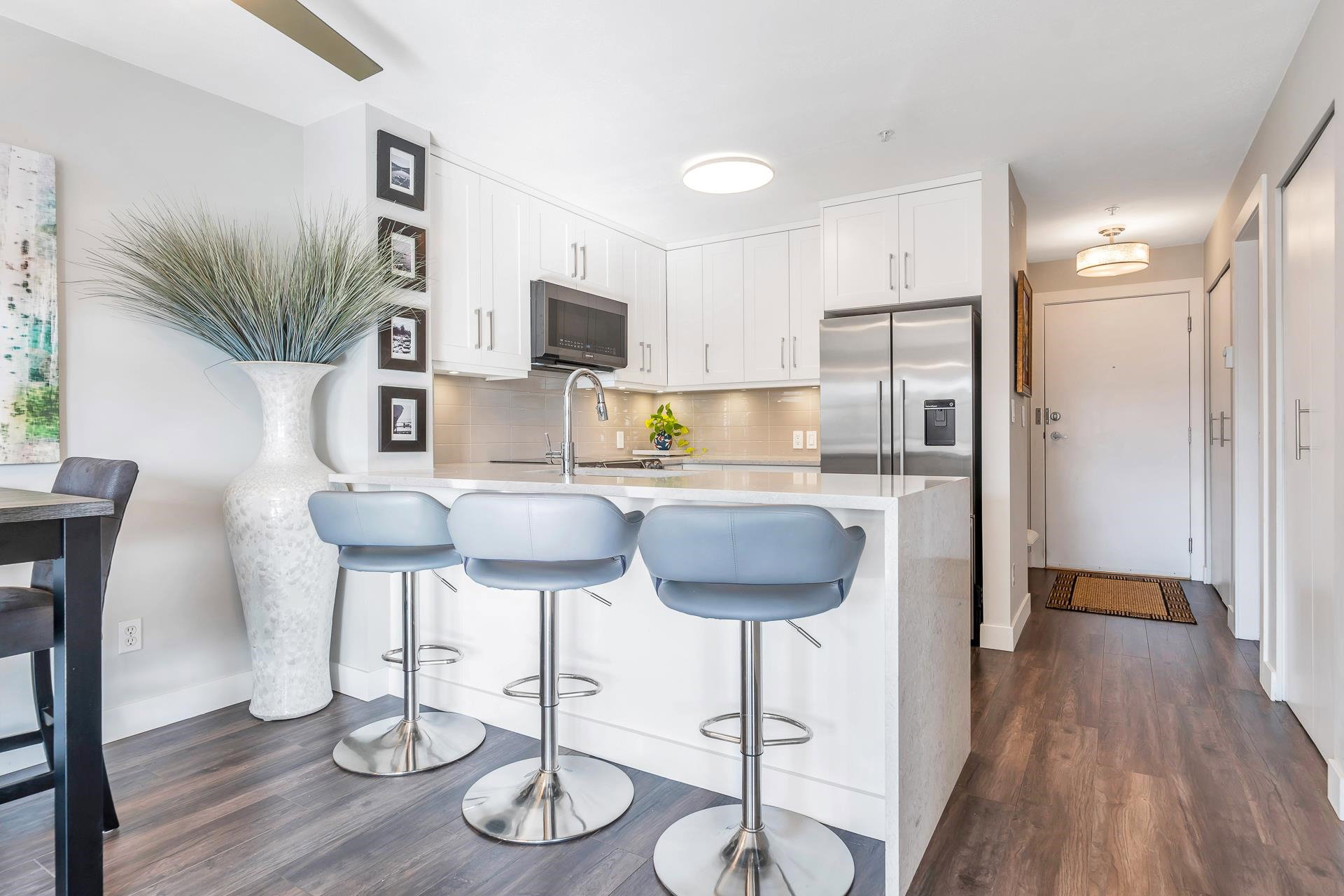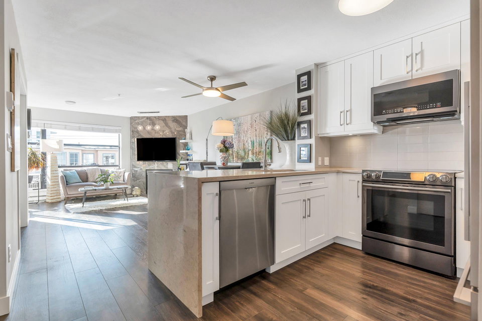MODERN, BRIGHT AND SPACIOUS LOWER LONSDALE HOME! Move right in! All the space you need is right here in this pleasing and tastefully renovated 2 bedroom, 2 full bathroom + den home. Entertain your guests in the fresh and modern kitchen with waterfall quartz countertop and stainless steel appliances. Bathrooms are beautifully tiled with rainfall shower heads. Cozy up with your family and pets by your gas fireplace in the welcoming open living plan. Enjoy the sunshine with the southern exposure of this home. Centrally located with easy access to Seabus, restaurants, shopping, recreation all within walking distance to name a few benefits of Lower Lonsdale living. This is the home you have been waiting for!